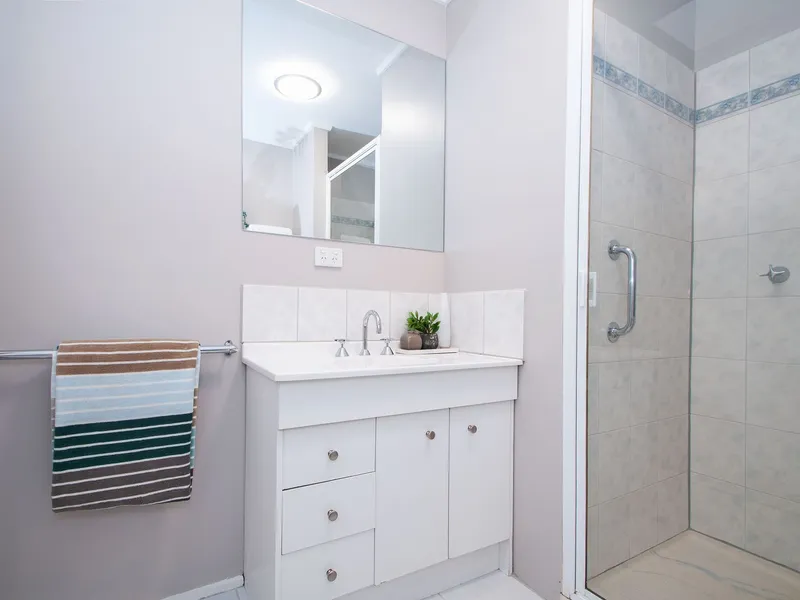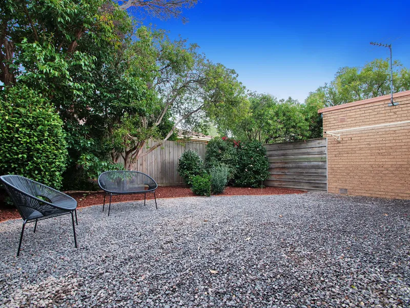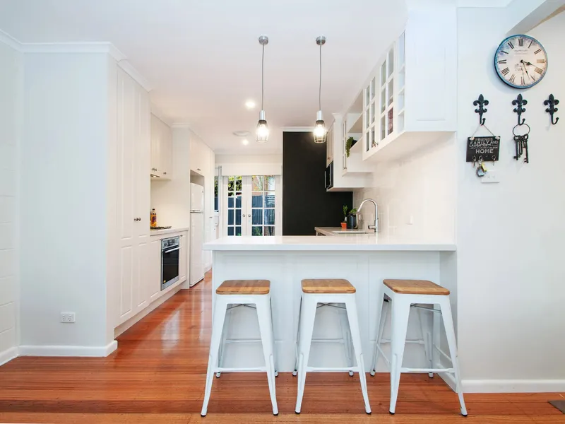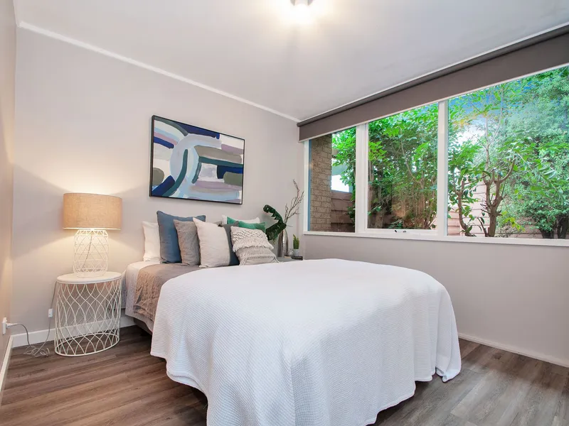 Quietly set back from the road, with expansive windows capture leafy garden views from every room, starting with the spacious lounge and dining zone and continuing through to the luxe kitchen that features beautiful crisp white cabinetry, a breakfast bar, subway tiled splashback and stainless-steel appliances that include a gas cooktop and dishwasher. Renovated bathroom/laundry facilities. With plenty of space to indulge in outdoor entertaining, further highlights include split-system heating and cooling and two undercover car spaces.