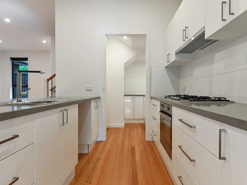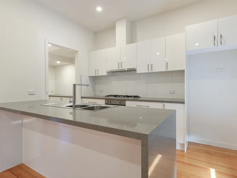 - The swish white and grey kitchen will make cooking an enjoyable experience. It features a full suite of stainless steel appliances, an abundance of storage including a walk-in pantry, tiled splashbacks, stone benches and a waterfall-edge breakfast bar