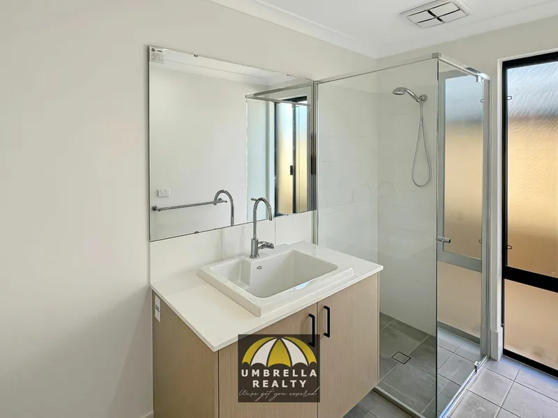 - Bathroom is well sized with vanity storage and free standing shower;