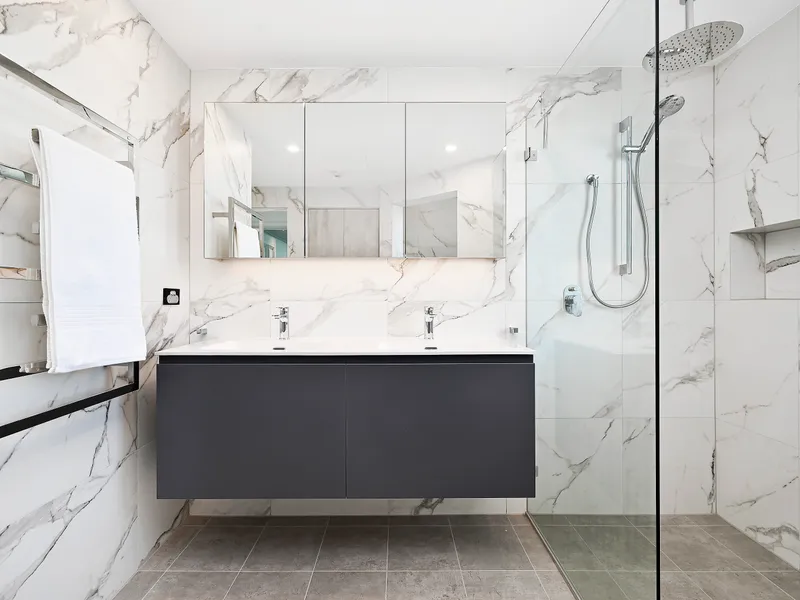 - Absolutely stunning marble bathroom with dual basin, rainwater shower head, heated towel rail, separate toilet & extra storage