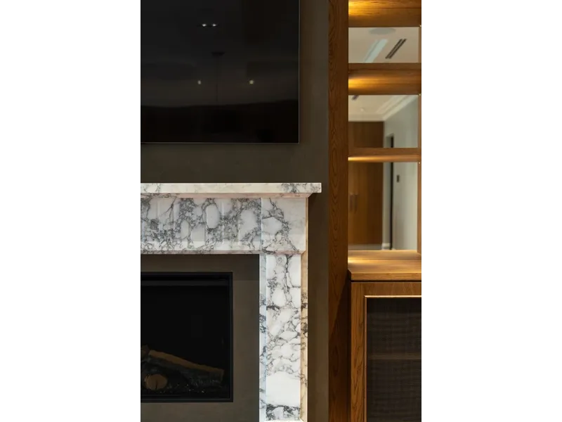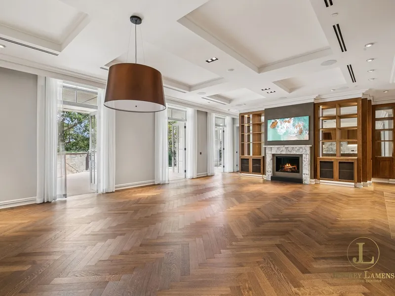 - Huge open living/dining room with library shelves, marble fireplace