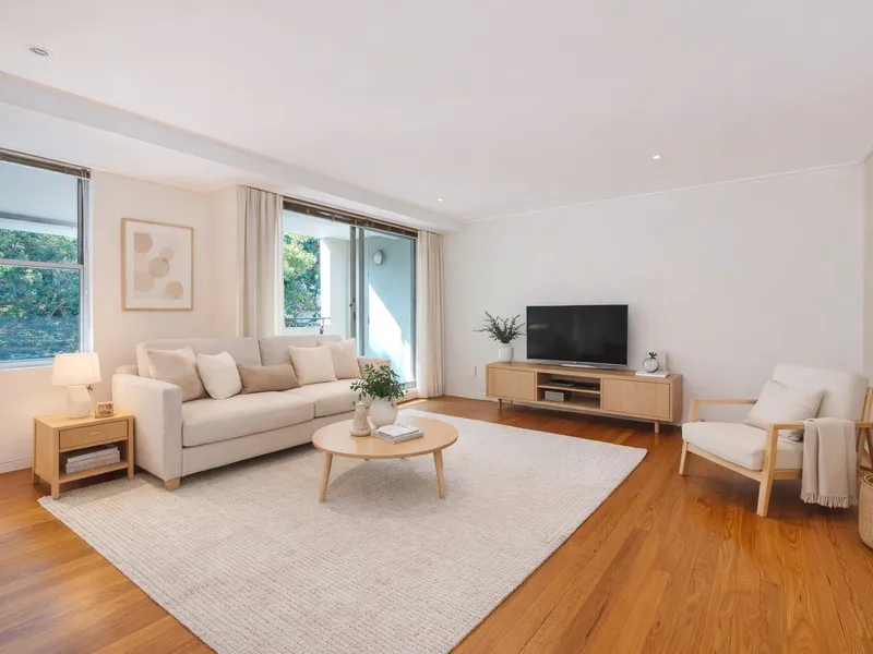 The light-filled living and dining area flows effortlessly onto a covered balcony with a leafy outlook, while the sleek kitchen is equipped with stone benchtops, gas cooking and stainless steel appliances, including a dishwasher. The main bedroom is well-appointed with a built-in wardrobe, private ensuite and its own balcony, enhancing the sense of space and privacy.