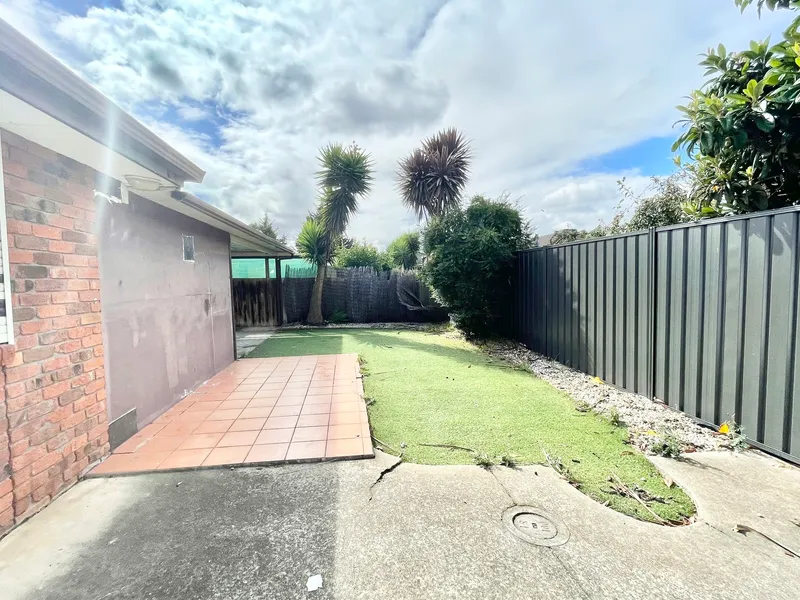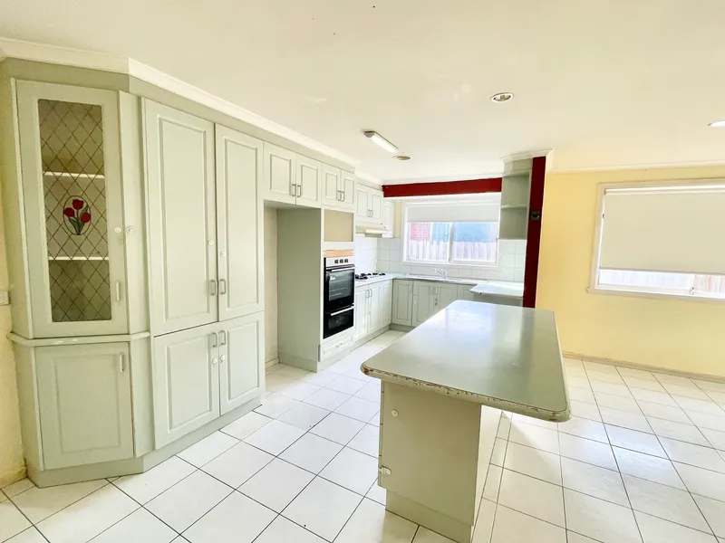 The well-appointed kitchen is equipped with a 900mm four-burner gas cooktop and rangehood, electric wall oven, and ample cupboard space. Adjacent to the kitchen, the open-plan meals area overlooks a covered pergola and low-maintenance rear yard, complete with a garden shed and single carport.