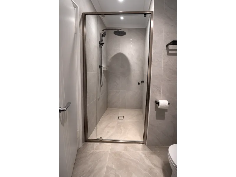 • Contemporary main bathroom with glass-enclosed shower, stone-top vanity and stylish fittings (no bath)