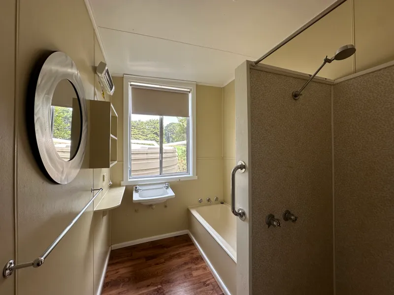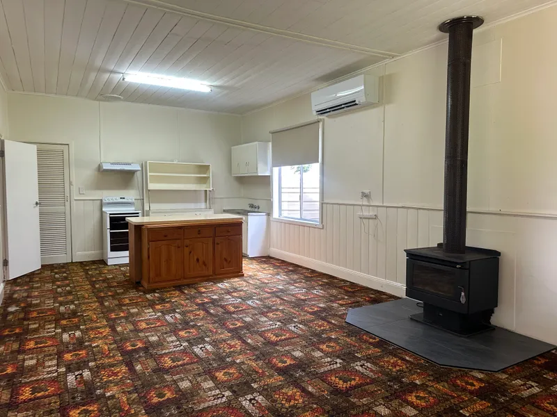 To the right, the open-plan living and dining area offers a welcoming space for relaxation. The lounge features a cosy wood heater and a reverse-cycle system, ensuring year-round comfort. The adjoining kitchen is practical, with an electric oven, cooktop, and just the right amount of storage.