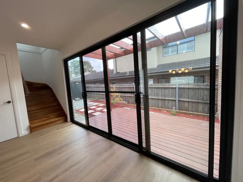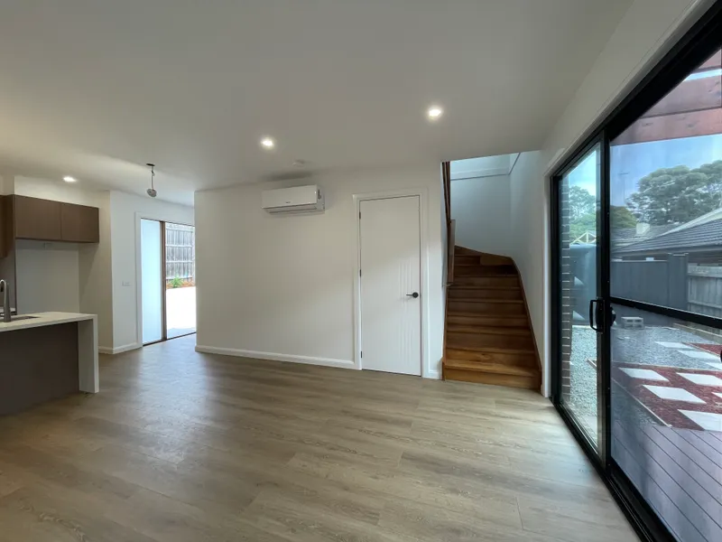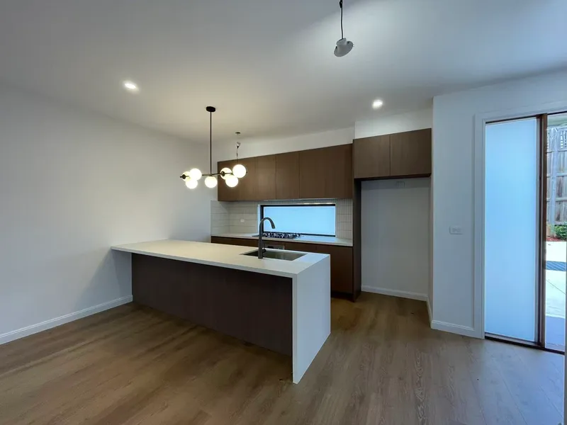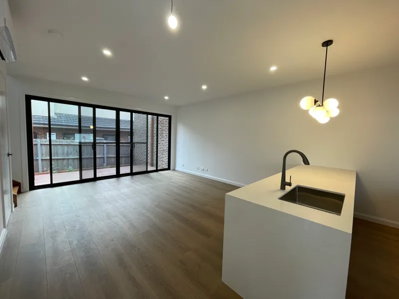 Thoughtfully designed across two levels, this home features a light-filled open-plan living and dining area that seamlessly connects to a sleek modern kitchen complete with stone benchtops, a large island with sink, quality appliances, and ample storage. Floor-to-ceiling sliding doors open to a private outdoor deck and courtyard, perfect for entertaining or relaxing.