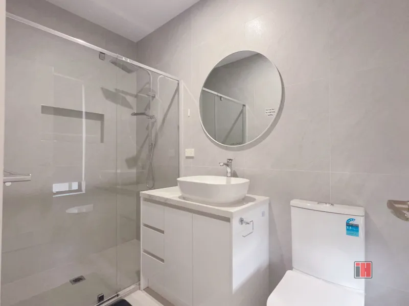 - Central bathroom finished with full-height tiling