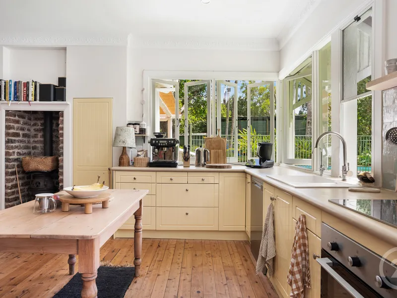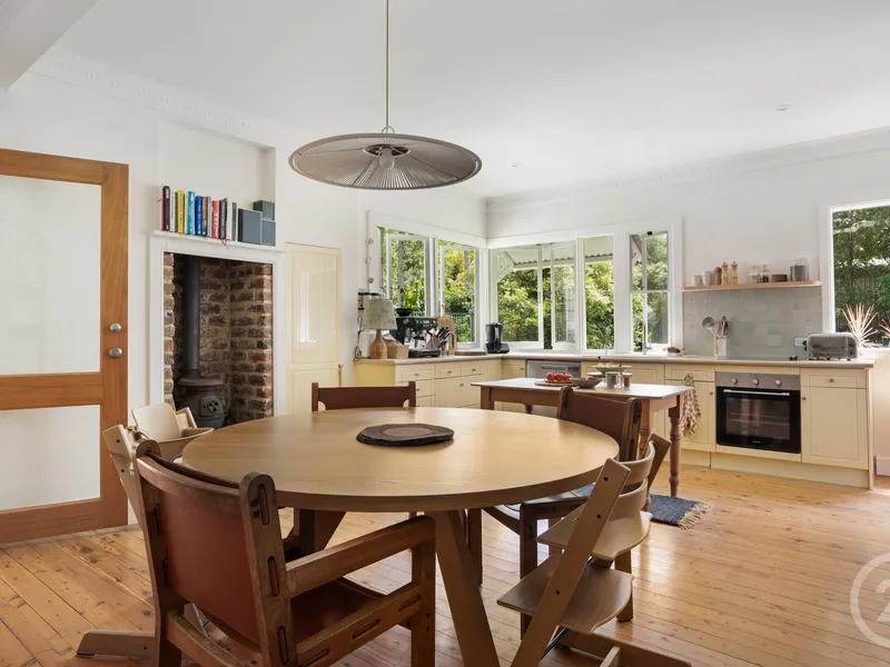 The morning sunlight fills the kitchen, adjoining screened verandah dining space and outdoor patio. In the cooler months, enjoy the historic potbelly stove in the main dining area. The property also includes a sizable home office or 4th bedroom and a further screened room on the hardwood verandah, perfect as a kids play area.
