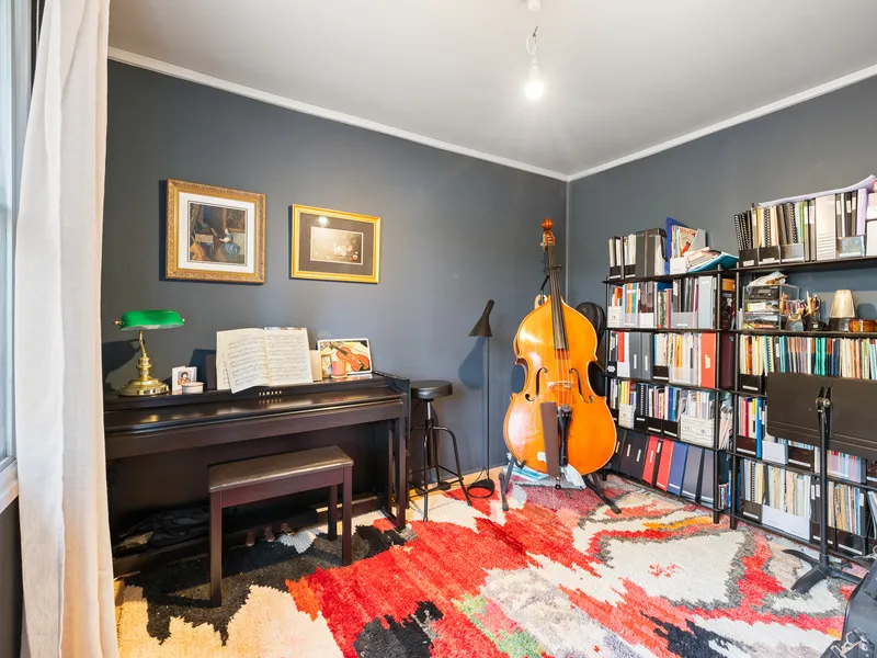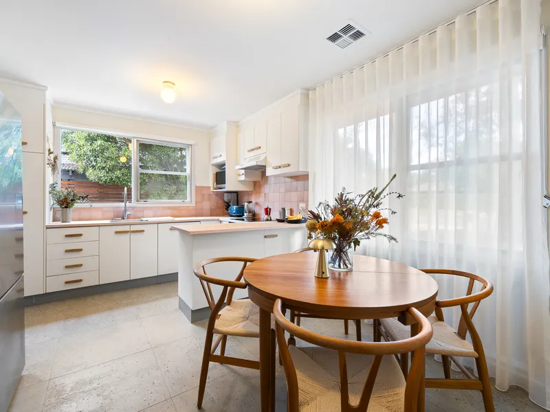 Inside, the home is light filled and thoughtfully arranged. A separate living area is framed by large windows, creating a welcoming and relaxed setting. Updated flooring and refreshed finishes enhance the interiors, while ducted heating and cooling and upgraded ceiling insulation support year-round comfort and energy efficiency. The open-plan kitchen and dining area form the heart of the home, appointed with an induction cooktop and oven, and designed for effortless everyday living.