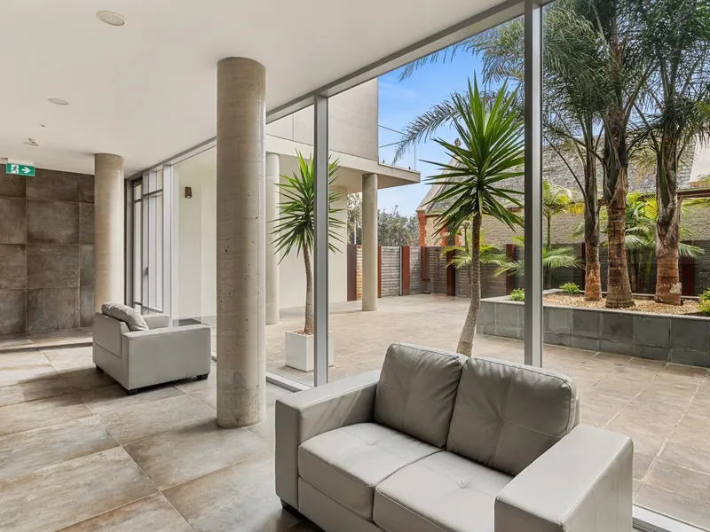 This apartment in the prestigious 277 Point Nepean Road building directly across the road from the beach enjoys views towards the bay but is tucked away on the tranquil side of the building with great privacy.