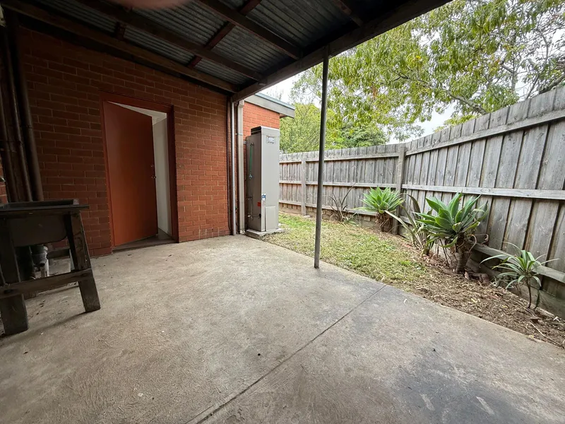A tidy bathroom with a shower-over-bath and a separate laundry area adds to the home's practical layout. Outside, you'll find a private, covered courtyard perfect for relaxing or alfresco dining.