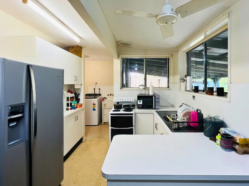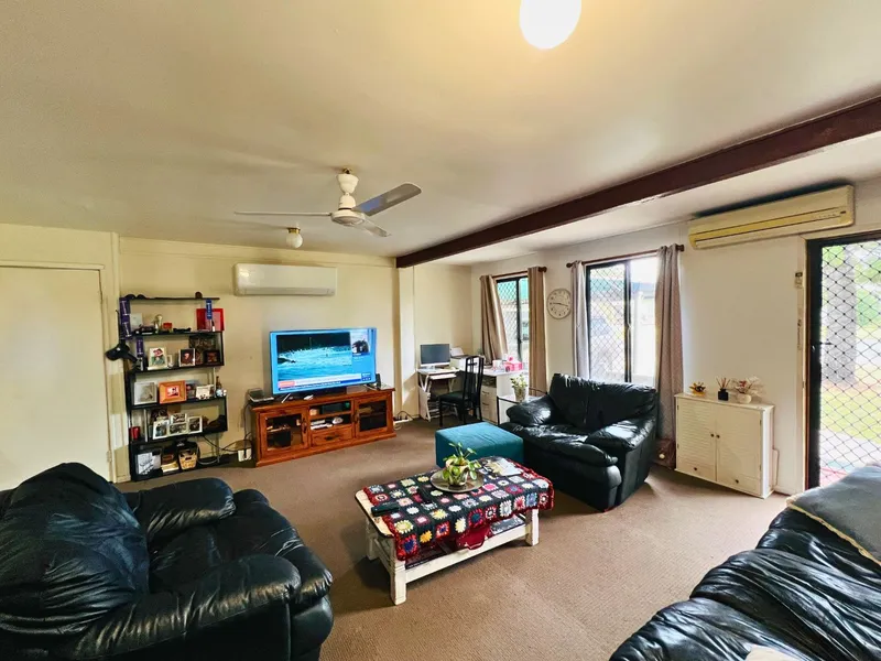Featuring a spacious lounge and dining area off the generous kitchen with ample storage, the home is fitted with air-conditioning and ceiling fans throughout for year-round comfort. There are three well-sized bedrooms, including a main bedroom with built-in robe, air-conditioning, and ceiling fan. The bathroom includes a separate bath, shower, and toilet.