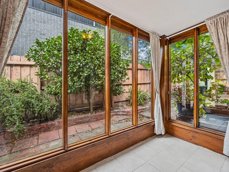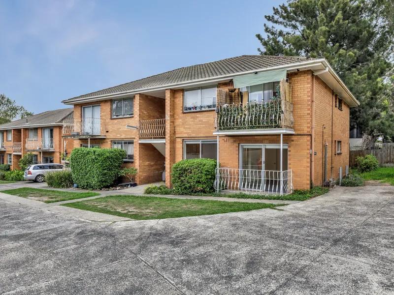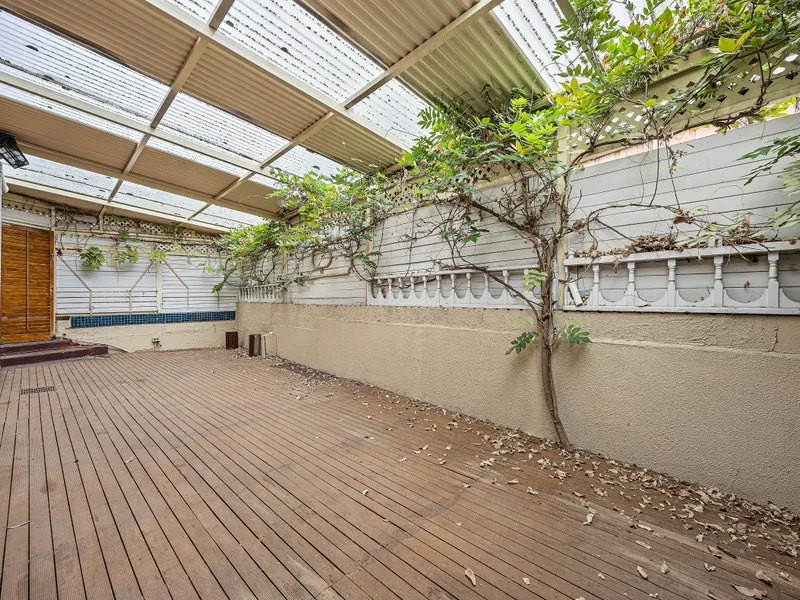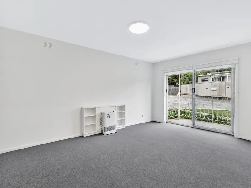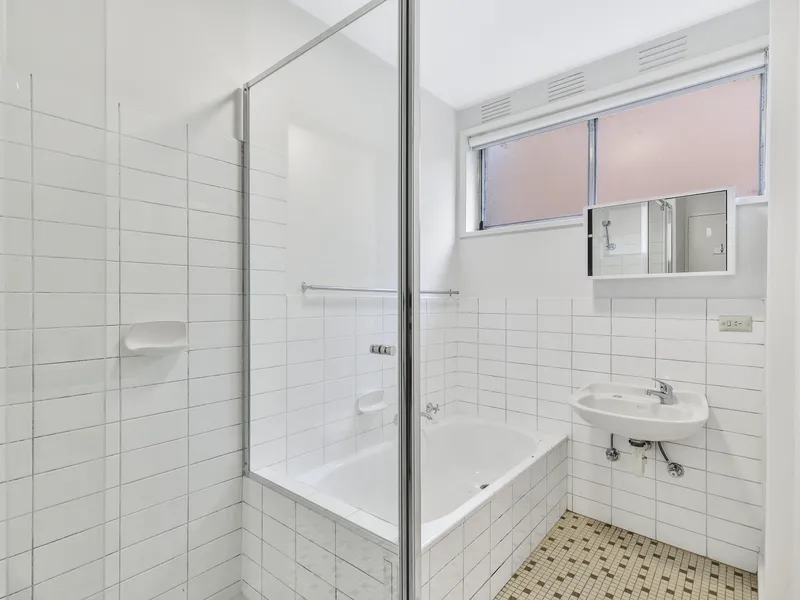 The sunny lounge area features gas heating and opens onto a private balcony. The renovated kitchen includes a gas stove, ample cupboard space, and room for a meals area. The central bathroom offers both a separate shower and bath, along with a toilet and laundry facilities. Both bedrooms are fitted with floor-to-ceiling built-in robes.