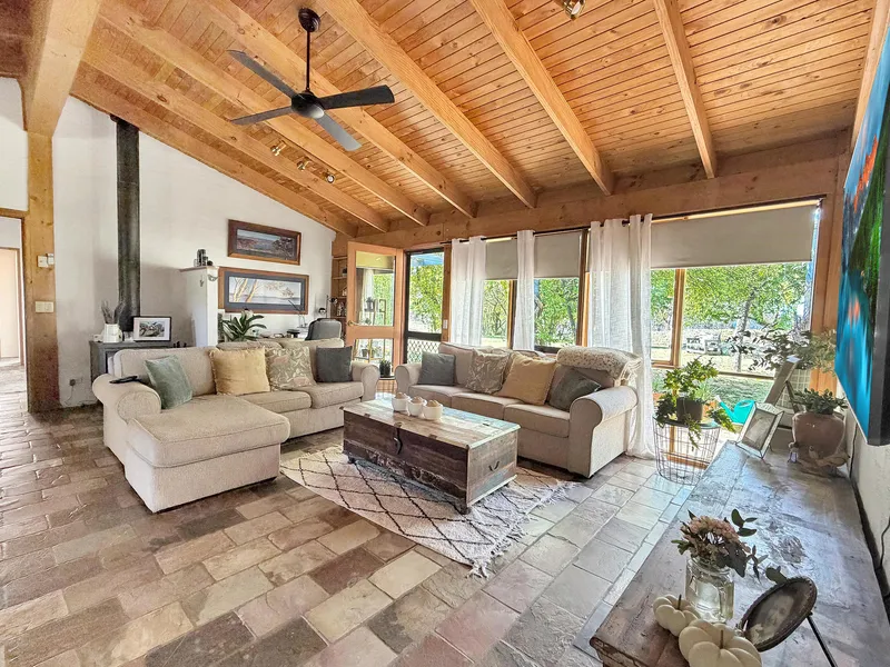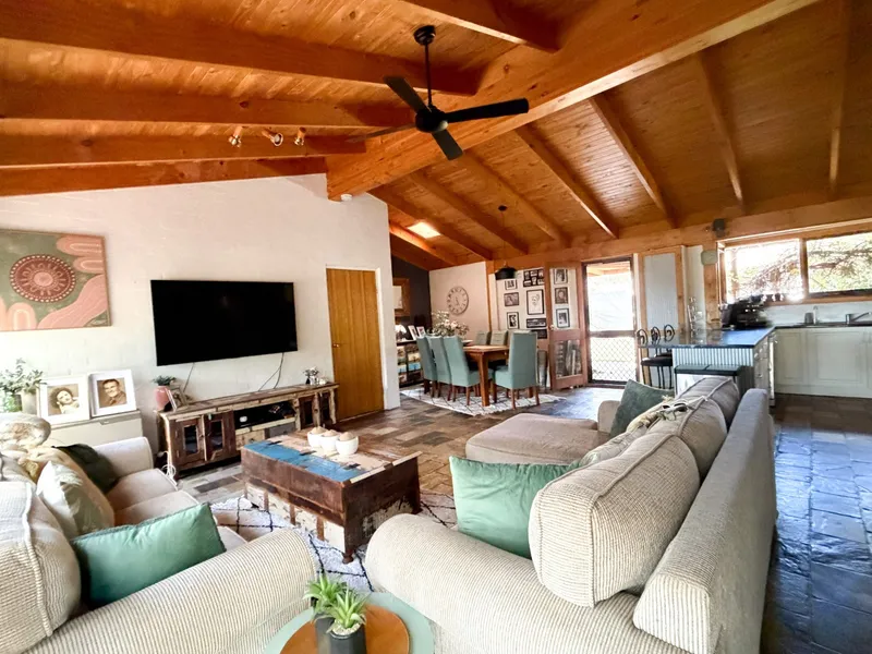 Slow combustion fireplace and reverse cycle air conditioning in the spacious living area