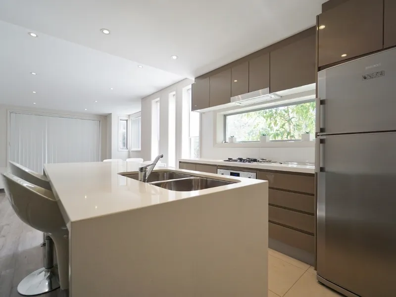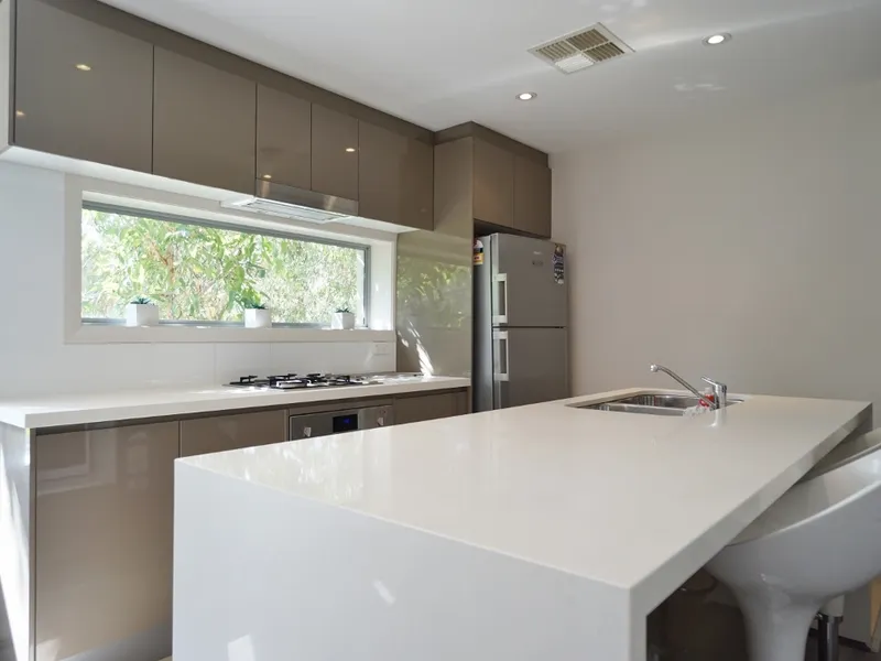 ?Modern kitchen with gas cooking and Caesar stone bench tops