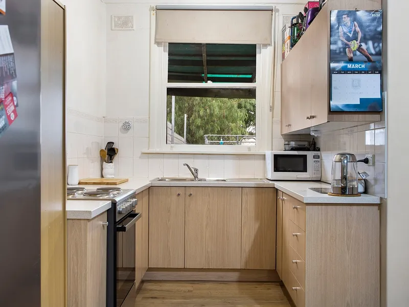 Inside, you'll step into a mostly open-plan layout that's both practical and welcoming. The lounge offers a cosy retreat, with roll-down blinds creating a cinema-style atmosphere and plush carpet underfoot. Flowing from here, the dining and kitchen zone features stylish floating floors, an electric cooktop, oven, and plenty of storage, plus a large window framing views of the garden.