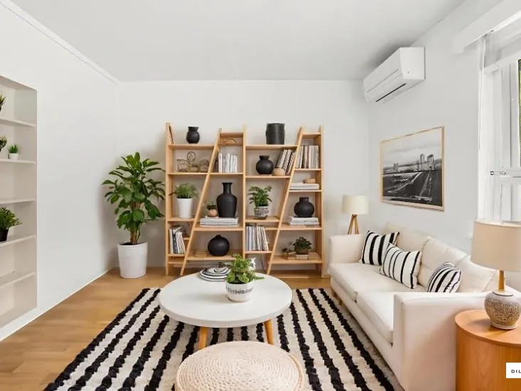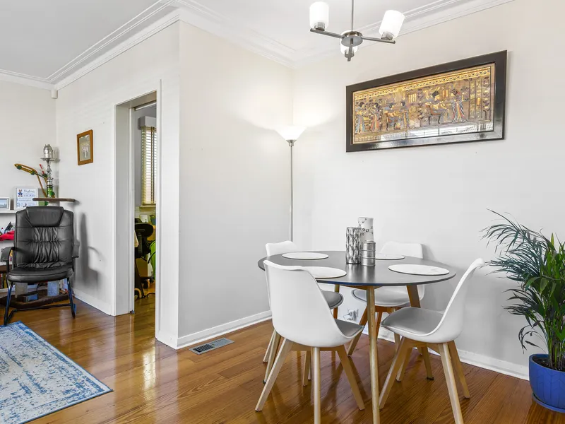 The home comprises two bedrooms with built-in robes, including a master with air conditioning. A generous L-shaped living and dining room also features air conditioning for year-round comfort. The updated kitchen is equipped with stainless steel appliances, gas cooking and a dishwasher, with a meals area conveniently positioned alongside. A central bathroom includes both a bath and separate shower, complemented by a separate WC. There is also a separate laundry with external access, ducted gas heating throughout, and the added convenience of a lock-up garage.
