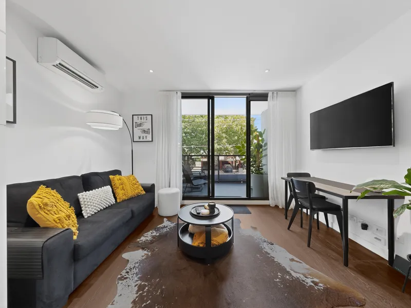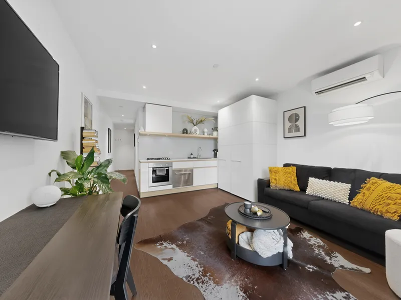 this 1 bedroom apartment offers a contemporary lifestyle right in the heart of Elwood. Secure entry with a video intercom and full lift access leads you to a beautifully designed space featuring a generous bedroom with built-in robes and a sleek kitchen appointed with stone benchtops, a Miele cooktop, Smeg rangehood and an integrated dishwasher. The living area opens to a north-facing balcony, perfect for enjoying sunny mornings or relaxed evenings. Comfort is assured year-round with split-system heating and cooling, With secure basement parking and Glen Huntly Road and Ormond Road cafs, shops, Elwood beach, Point Ormond Lookout, Elsternwick Park and transport all at your doorstep.