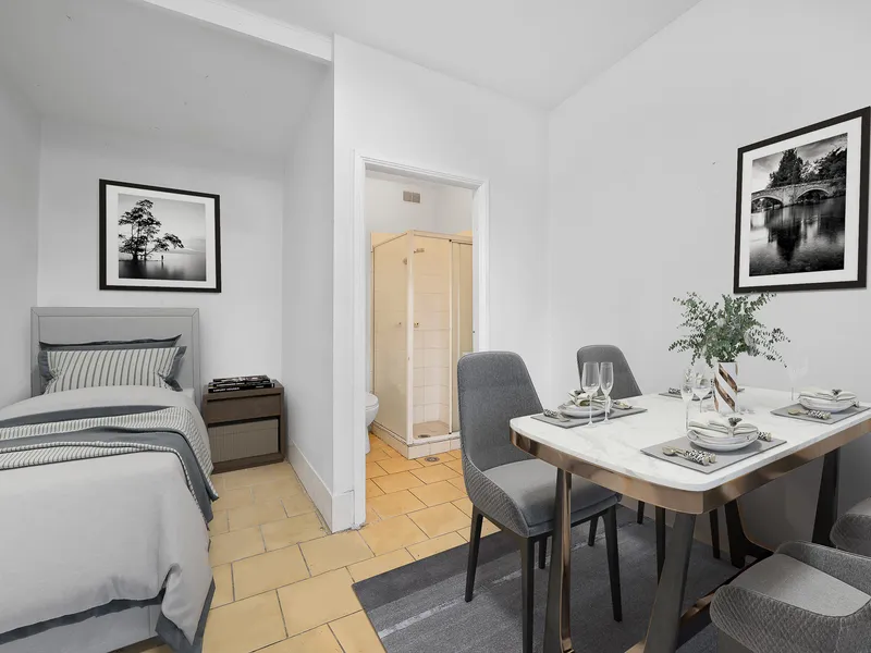 This renovated studio is positioned moments from local amenities. This home features an updated kitchen and bathroom, built-in wardrobes, and laundry facilities.