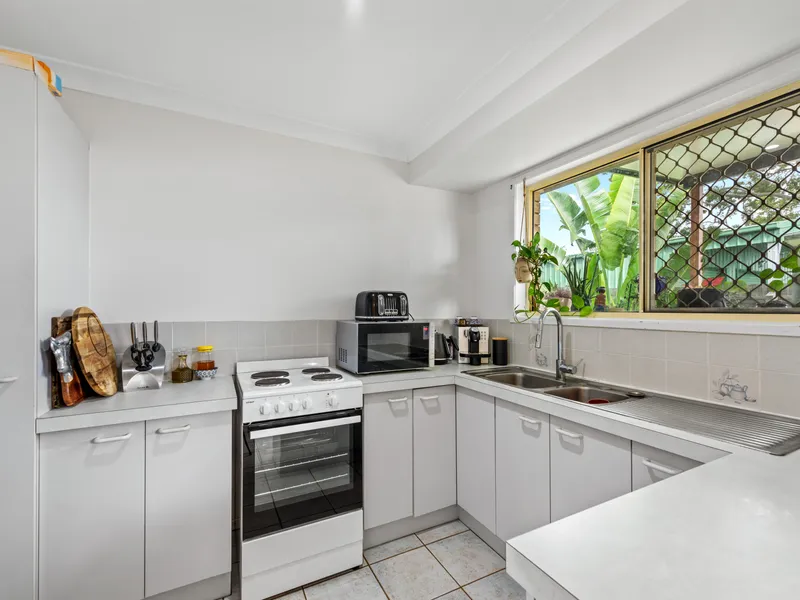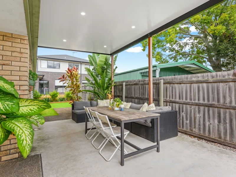 Designed with easy living in mind, the home features a generous living area, functional kitchen and a seamless connection to the outdoor entertaining space. The fully fenced backyard is complete with faux turf and established greenery, creating a lush, tropical setting ideal for entertaining or unwinding.