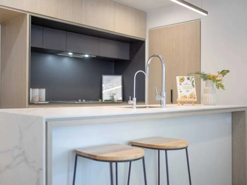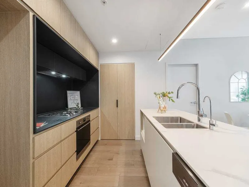 • Premium residences featuring kitchens with marbled porcelain benchtops, Smeg appliances and generous full-height, timber-look cabinetry