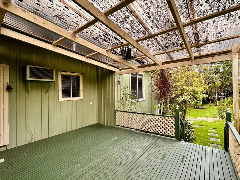 Covered rear deck overlooking a large private backyard