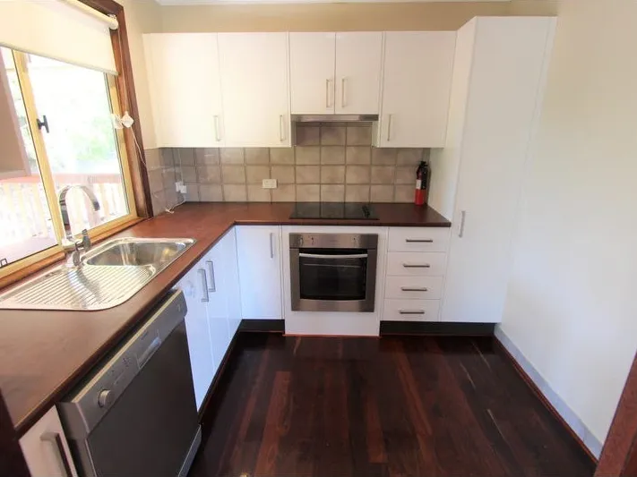 Upstairs features polished timber floors and a light-filled living area that flows seamlessly through to the large deck overlooking peaceful bushland. The renovated kitchen is well-appointed with stone benchtops, a 5-burner gas cooktop, and dishwasher, making it ideal for everyday living and entertaining.