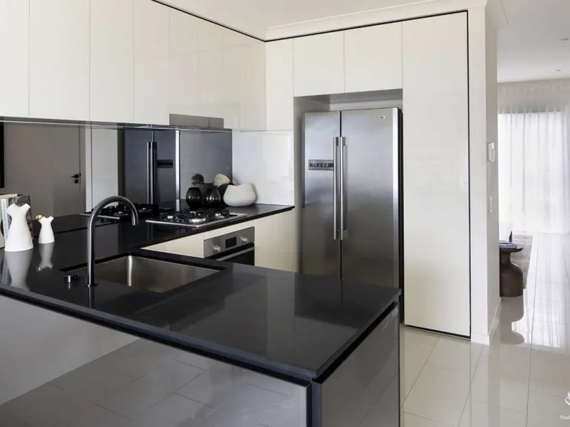 * Premium kitchen featuring reconstituted stone bench tops and stainless-steel kitchen appliances, including dishwasher and gas cooktop