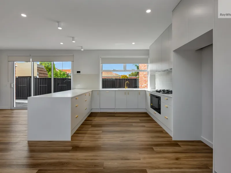 Designed with generous proportions, the light-filled open-plan living and dining area forms the heart of the home, seamlessly connecting to a private courtyard and outdoor entertaining space. The contemporary kitchen is beautifully appointed with stone benchtops, quality appliances, a gas cooktop, ample cabinetry and a large island bench, ideal for both everyday living and entertaining.