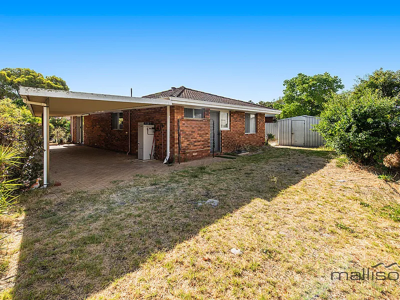 - Enclosed backyard with undercover patio, lawn area, and garden shed.