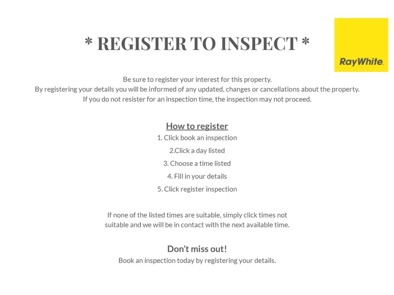 TO REGISTER CLICK ABOVE "BOOK AN INSPECTION TIME" TO REGISTER FOR AN AVAILABLE INSPECTION AND SUBMIT YOUR DETAILS.