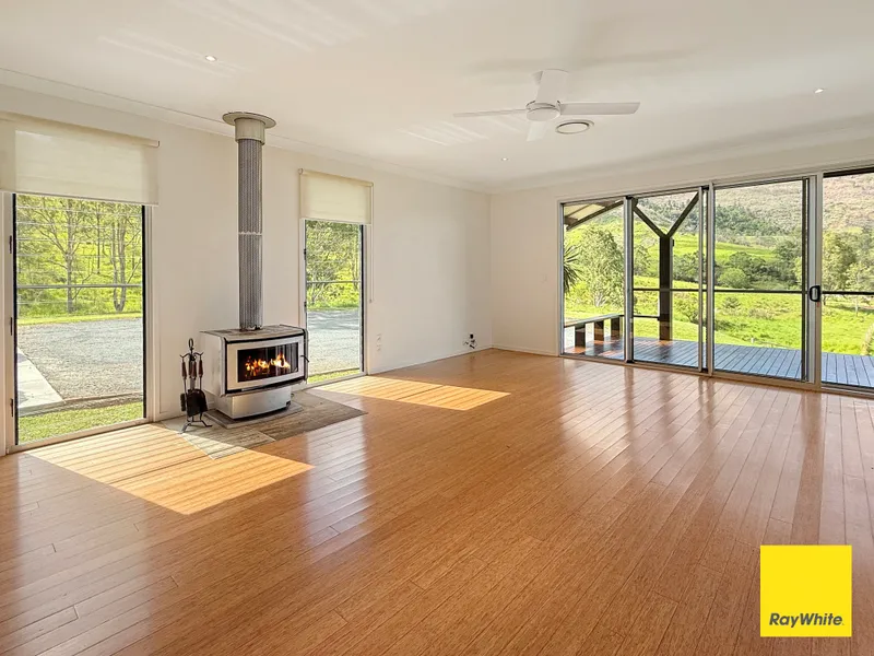 Inside, comfort is assured year-round with ducted reverse-cycle air conditioning and a feature fireplace, creating a warm and inviting atmosphere during cooler hinterland evenings.