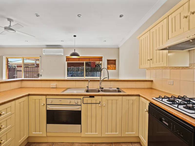 The home features three generous bedrooms, two with built-in robes, a light-filled living area, and a functional kitchen with ample cupboard space overlooking the dining area. A well-appointed bathroom with a separate toilet adds extra convenience for everyday living.