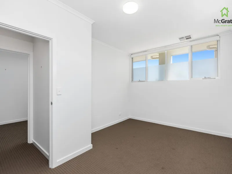 Outside offers a private low-maintenance courtyard and an oversized single garage with automatic door.