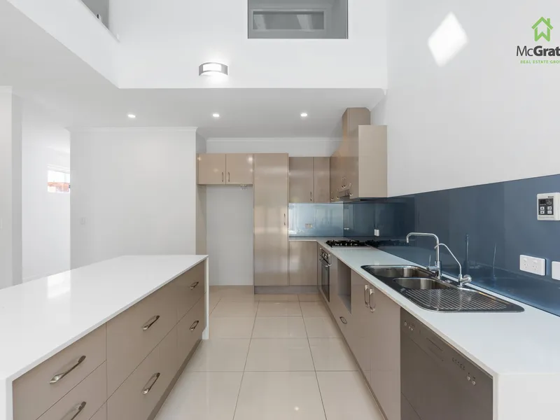 Featuring a great open-plan living and dining space, designer kitchen with stone benchtops, stainless steel appliances, gas cooktop and island breakfast bar, plus a stunning light-filled void creating a striking architectural feature.