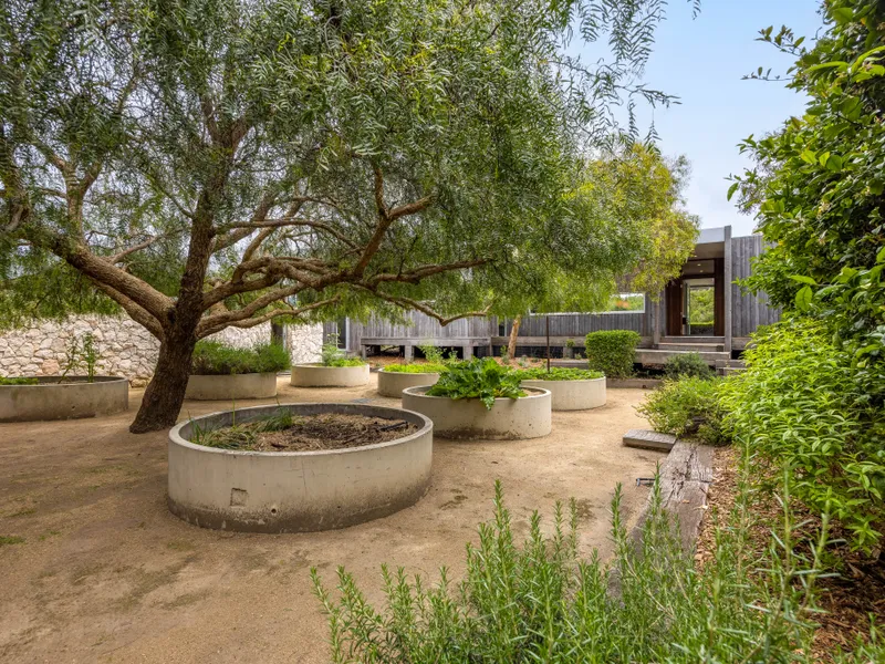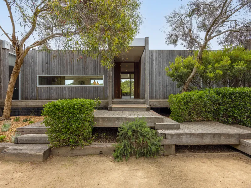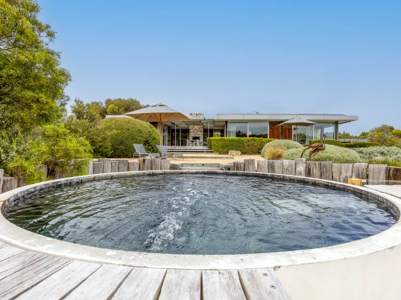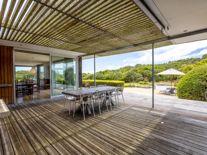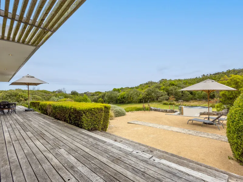 The sensational central alfresco dining zone showcases reclaimed timber decking, which also frames the house and leads out to multiple zones of the garden. Including plunge pool, meandering pathways/tracks, mature orchard and surrounding fields abutting the Dunes golf course, proximity to Cape Schanck Lighthouse and the St Andrews Beach hinterland.
