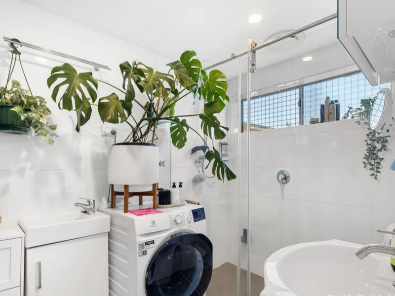-Modern bathroom features a walk-in shower and internal laundry facilities.