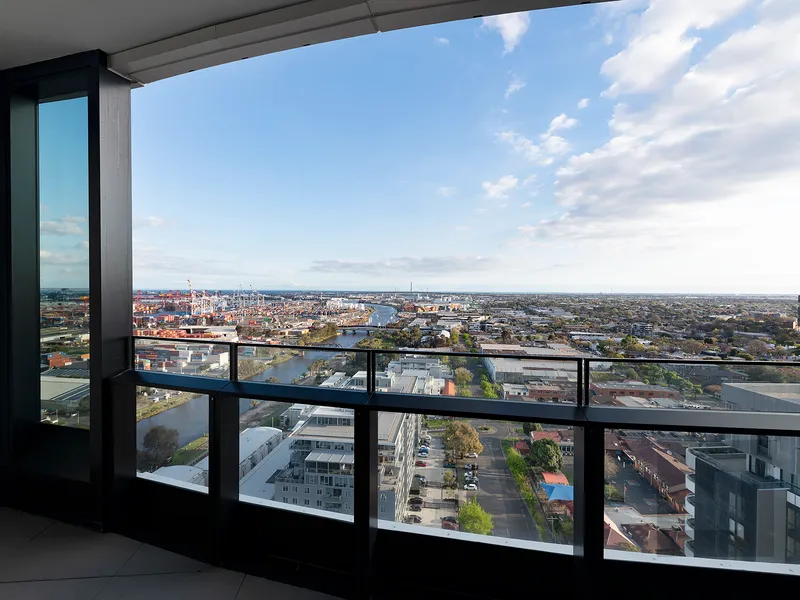 - Living room opening to the balcony with views over Melbourne and beyond