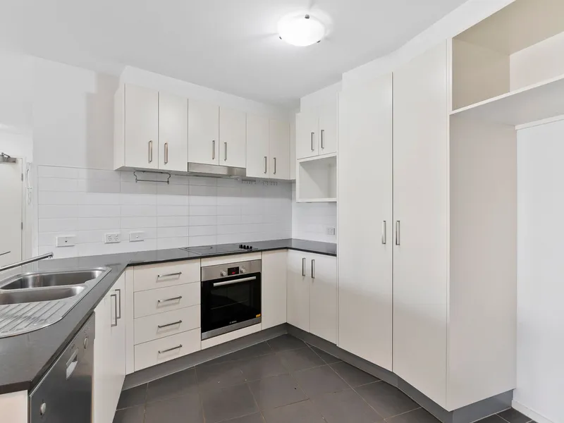 The apartment has recently been refreshed with paint, carpets, and features a practical, modern kitchen with ample storage, quality appliances, stylish finishes, and an easy-flowing open-plan living and dining area. Floor-to-ceiling windows bathe the space in natural light, while the generous balcony extends the living area outdoors, perfect for relaxing or entertaining.