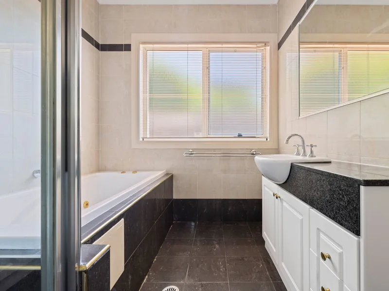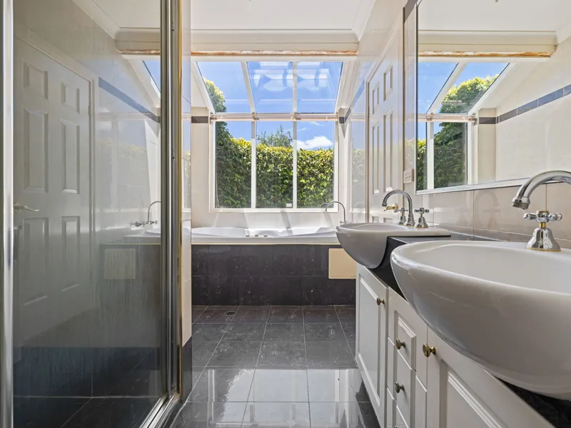 The spacious main bedroom boasts a walk-in robe and show-stopping ensuite, complete with a luxurious spa bath, dual sinks and an abundance of natural light through the windows/skylights.