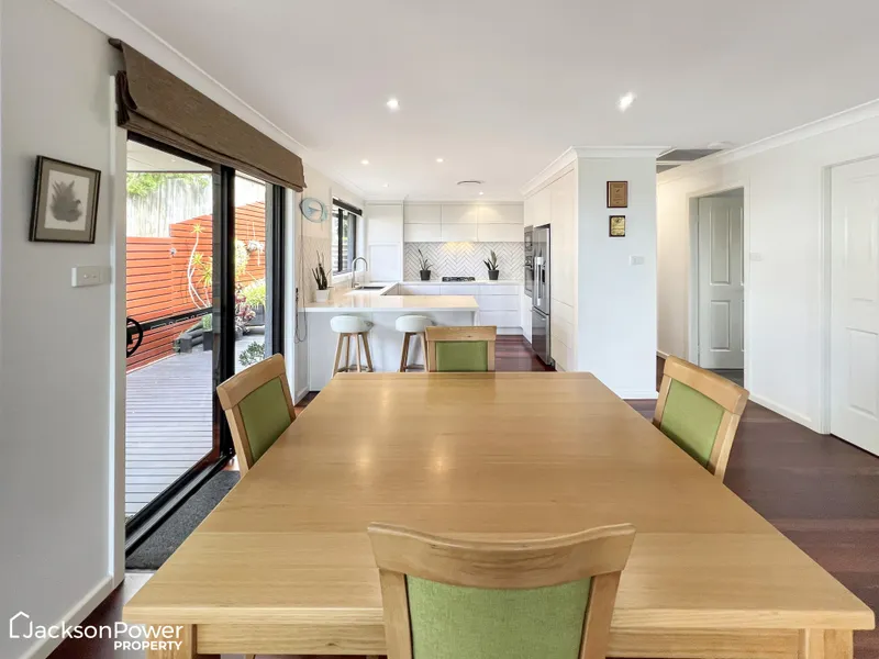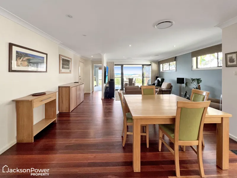 • Spacious open dining and living featuring stunning polished hardwood timber floors opening onto large covered, private outdoor entertaining deck with LPG gas point.