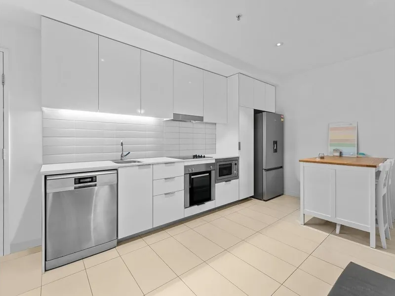 The apartment features a spacious bedroom with built-in robe, air-conditioning and tiled flooring throughout. The open plan living and dining area flows to a well-appointed kitchen with electric cooktop, dishwasher and pantry, along with a separate study nook with built-in desk. Step out onto the oversized balcony and enjoy stunning city views.
