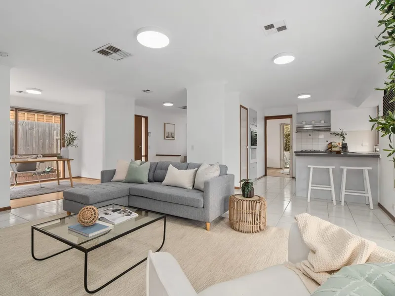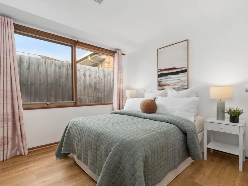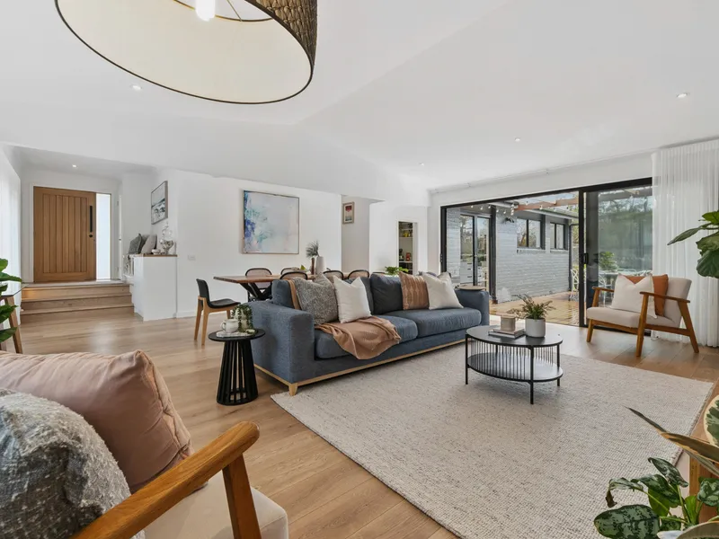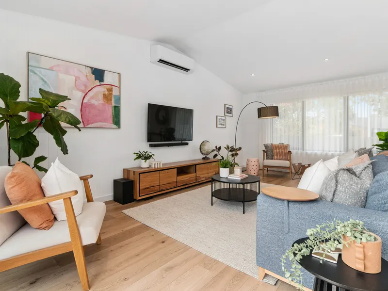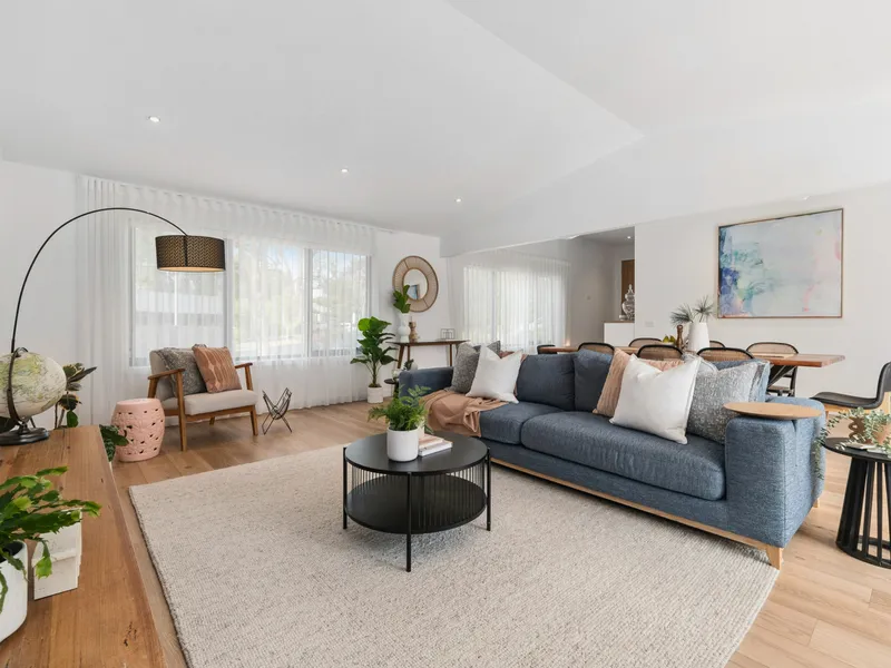 Painted in neutral tones and featuring modern floating floors, the home is light-filled throughout and ready to move straight in. A generous front living room is complemented by a separate dining area adjoining the kitchen, with seamless access to a covered outdoor entertaining space.