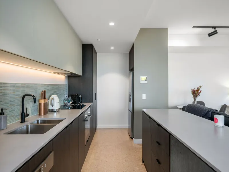 - Functional Kitchen: A modern kitchen space equipped with an electric cooktop, oven, and stone benchtops.