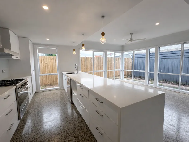 - Spacious kitchen & living spaces anchored by polished concrete flooring
