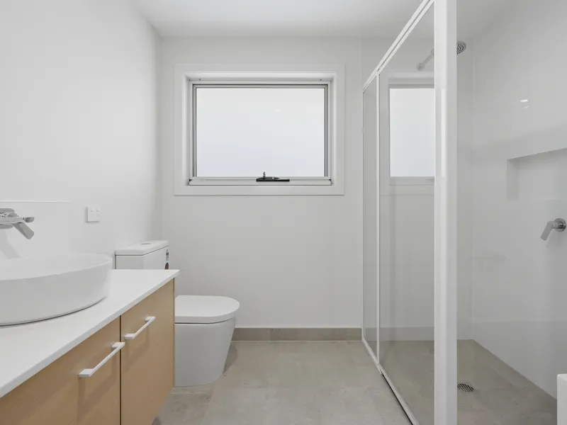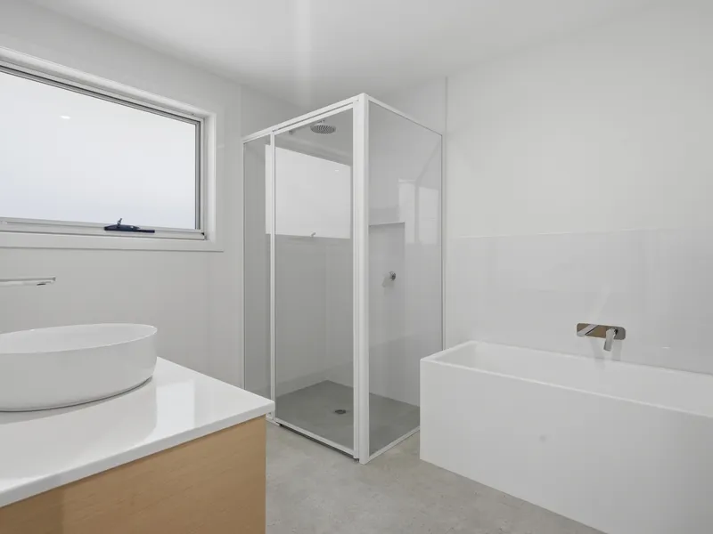 Inside, you’ll find two comfortable bedrooms, both with built-in robes and soft carpet underfoot. The main bedroom is a great size, giving you a bit of extra space to spread out. The bedrooms are positioned on either side of the main bathroom, which features a stylish freestanding bath, separate shower, and the bonus of a second toilet.