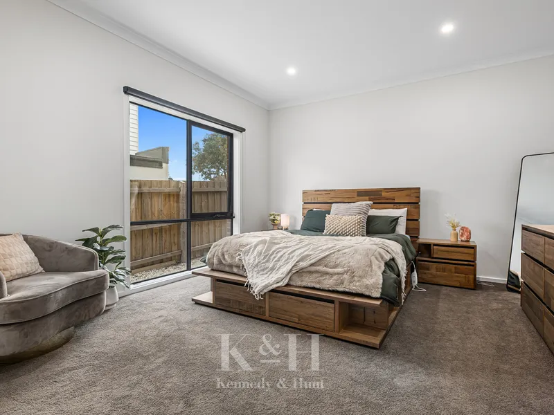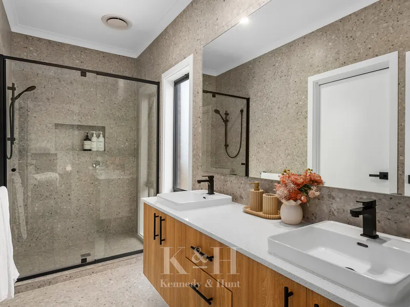Downstairs, the master suite is a true sanctuary with a spacious walk-in robe and a deluxe ensuite boasting dual vanities.