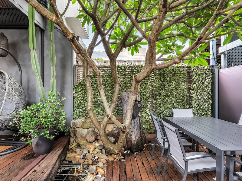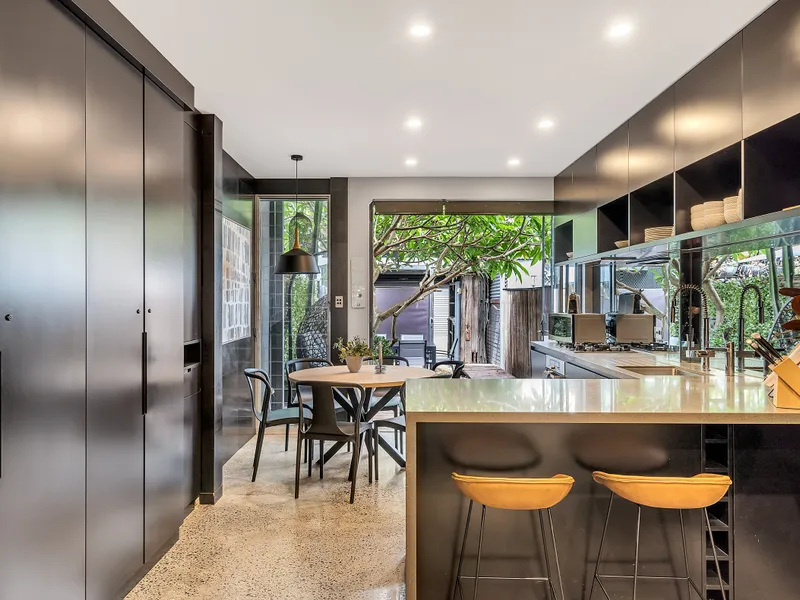 Edgy black walls and atmospheric polished concrete floors lead to the large open-plan living and dining area, where the industrial finish of this 2-storey home is softened by the natural views of your private sunny courtyard garden. Boasting two seating areas centred around a stunning frangipani tree, this is the perfect place to enjoy your morning coffee or a few sundowners on a warm afternoon after a long day of exploring!