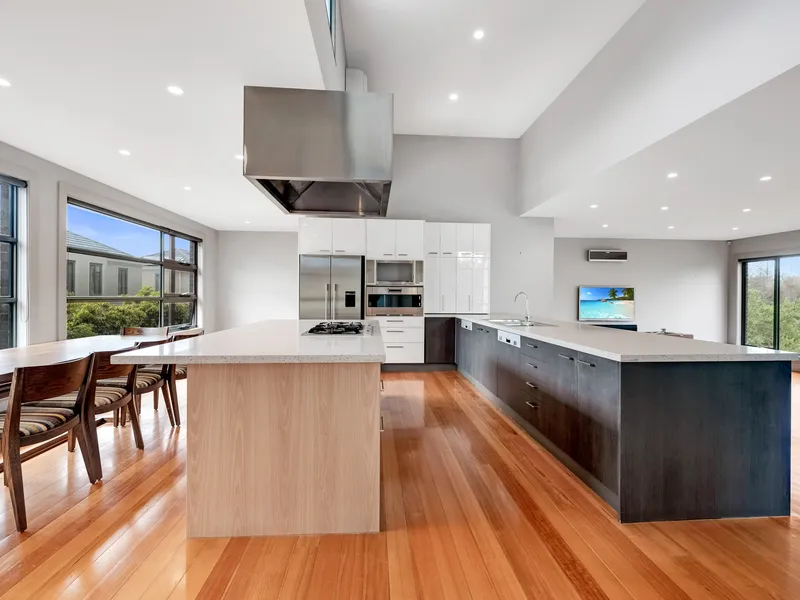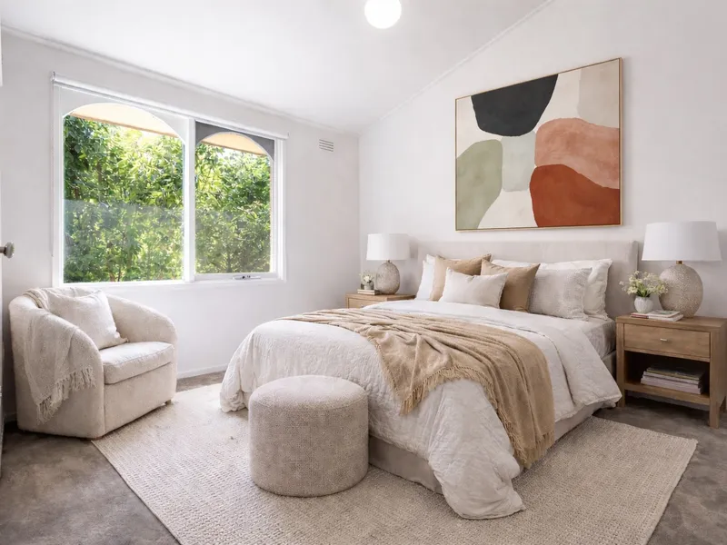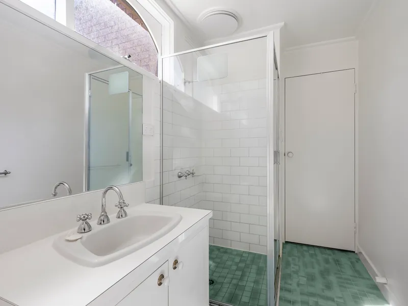 An updated kitchen and meals area flows effortlessly to a spacious, sun-filled living domain, extending to a large paved outdoor entertaining area. Upstairs, both bedrooms feature robes and share a stylish bathroom with separate bath and shower.