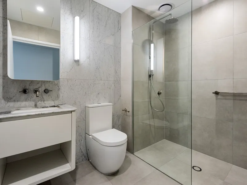 The main bedroom is a luxurious retreat, featuring custom built-in robes and a beautifully appointed ensuite with double stone vanity, thoughtfully themed to the equally elegant central bathroom. Additional features include central heating, air conditioning, full double glazing, two secure non-stacker car spaces and a storage cage.